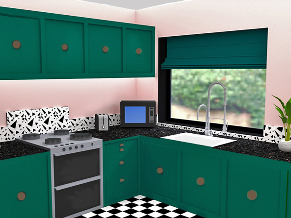 Concept Two - Inspired by the funk and colour of Versace, the ground floor is divided into an open plan living/dining area seating up to six guests comfortably around the table, as well as seperate kitchen area seperated by a sliding glass door.